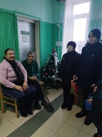 Дети поздравили пожилых людей с наступившим Новым годом и Рождеством. Побеседовали с Вырвич Натальей Владимировной и Кейзик Гордеем Ивановичем, вручили им сладкие подарки.